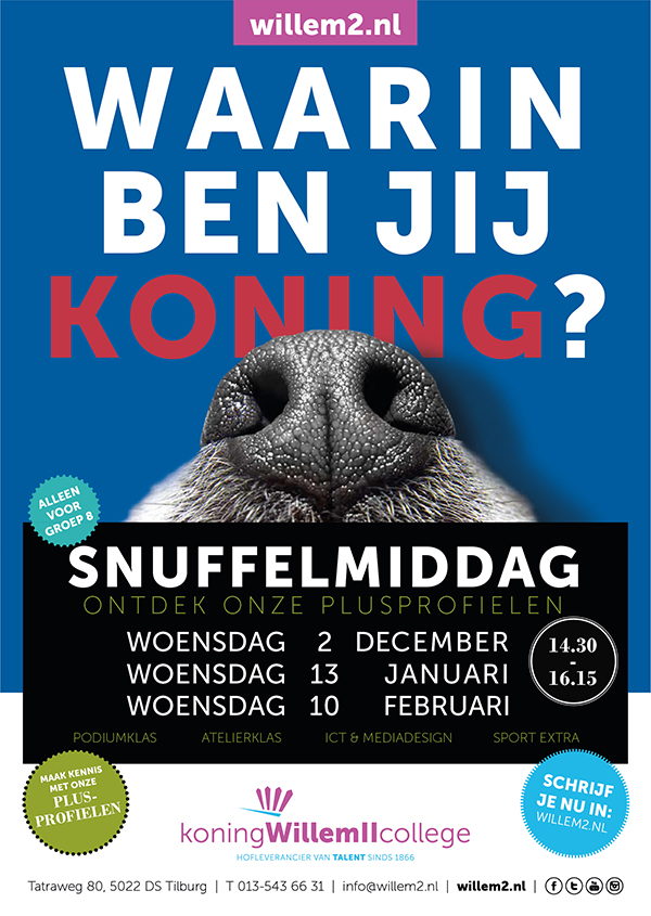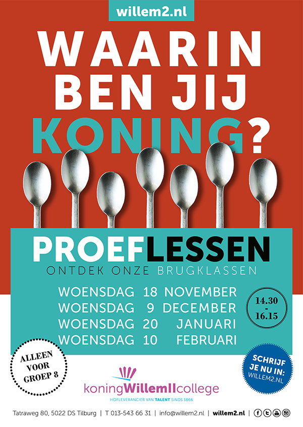 We hebben lessen van 60 minuten. Koning Willem II College Tatraweg 80 5022 DS Tilburg T 013-543 66 31 F 013-535 24 65 info. Aanmelding Koning Willem II College - Inschrijven Snuffelmiddag.